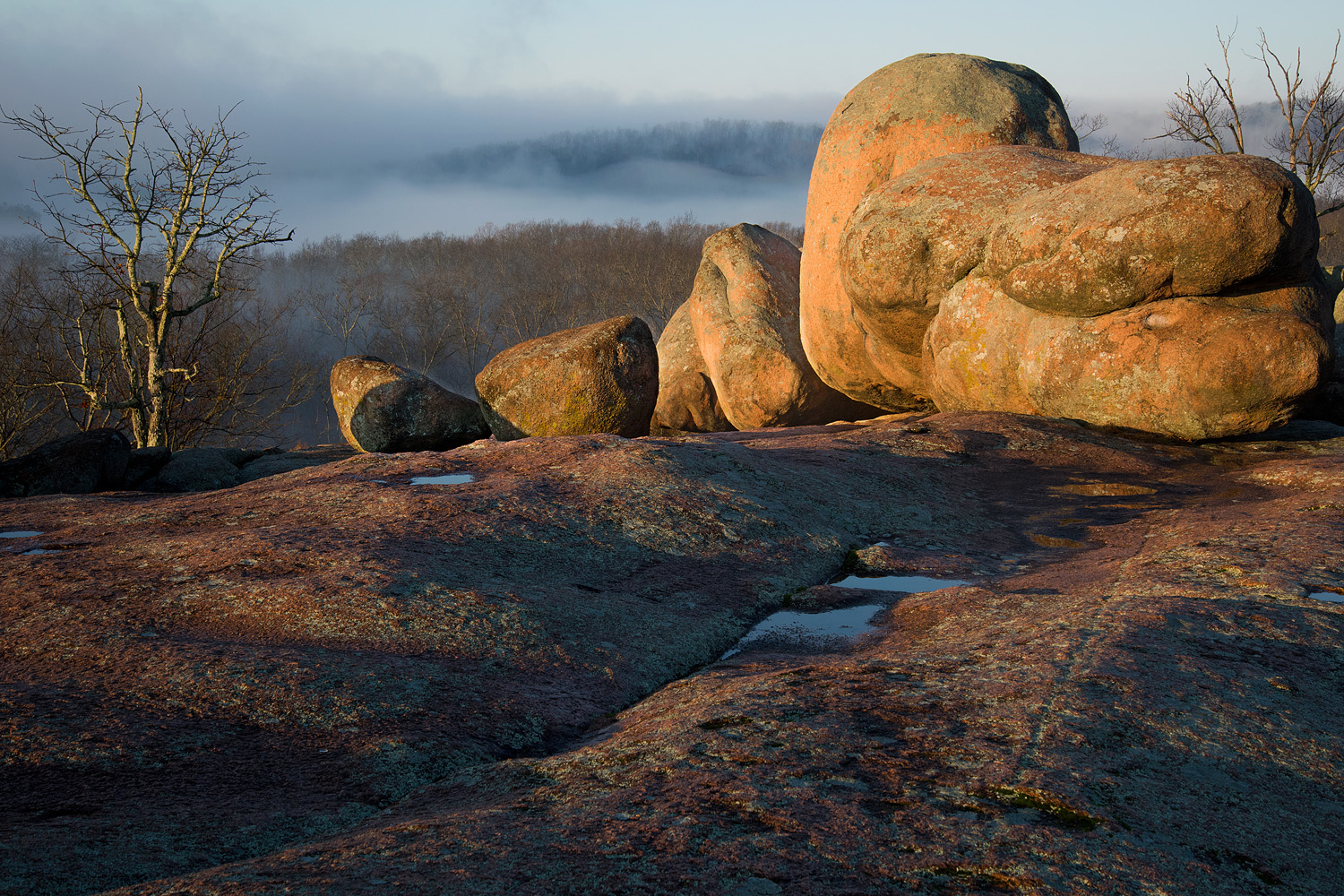 There are also unique geological features found in this region. The Saint Francois Mountains in SE Missouri are extinct volcanoes and ancient lava flows. Most have been exposed for over one billion years. With its acid soils it make for great plant diversity. When a river or creek flows through one of the lava flows you have what Missouri calls a shut-in (water is restricted or shut-in to a narrower passage due to the slow-to-erode nature of the underlying granite). These are extremely attractive to photograph in all seasons. Unfortunately, some of the more attractive ones are well visited. So unless you’re early or late in the day you may find yourself in large crowds. These are not tall mountains, being eroded for eons, but this is still mountainous country.