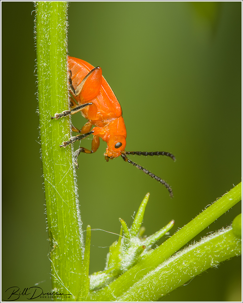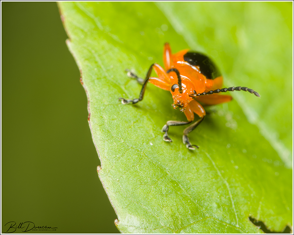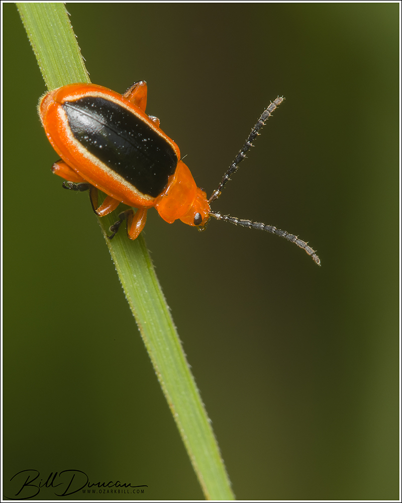 These plants were found in a poor scrub prairie habitat along with blackberry and even more poison ivy. We started looking, finding and searching between 50 and 100 of these short plants. We looked very closely and I had a chance to try my DIY collapsible beat sheets that I made over the winter. No luck. I couldn’t believe it. I really thought we had a good chance. We knew the species had been found in the park and here we were within a sizeable population of the host plants. You’ve seen the photos already, so obviously we found our target. And, of course, insect finder extraordinaire, Sarah, was the one to find the beetle on a ragged, half-eaten P. incarnata plant. I immediately got to work photographing from a safe distance. One of the reasons they call them flea beetles is that they will jump great distances upon being disturbed. Ultimately, we found four individuals all on the same plant. Thankfully, this species is quite large for a flea beetle and I didn’t need to get too close that higher magnifications would require.