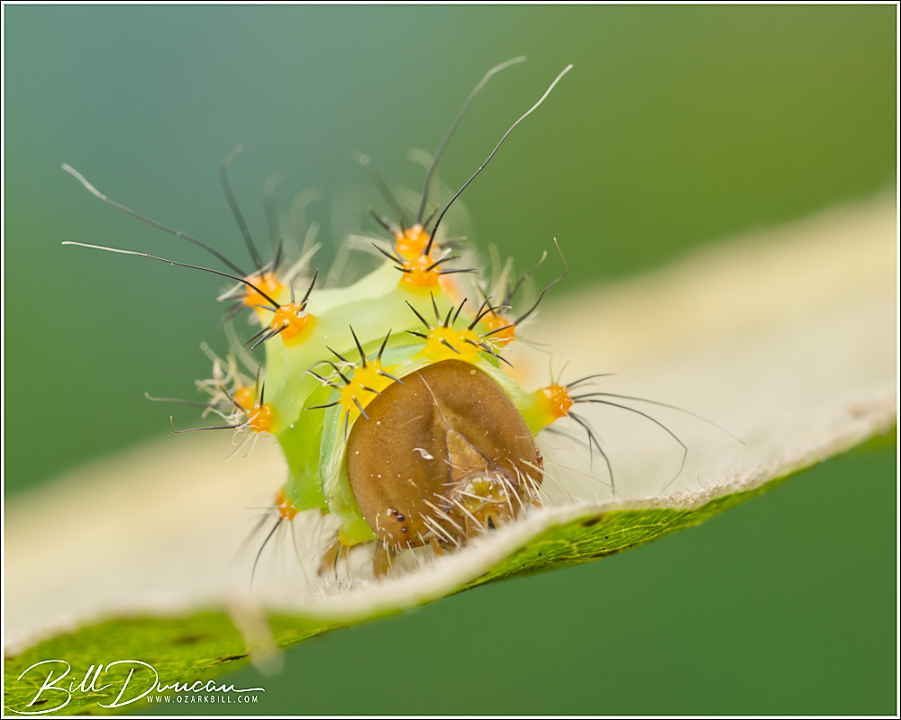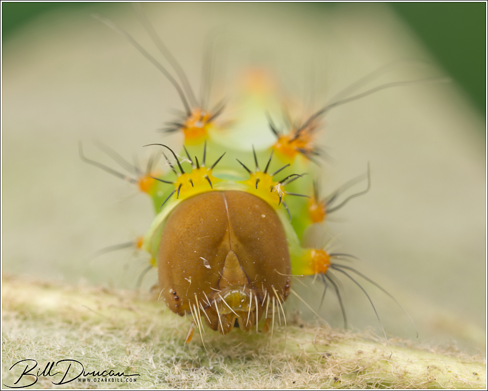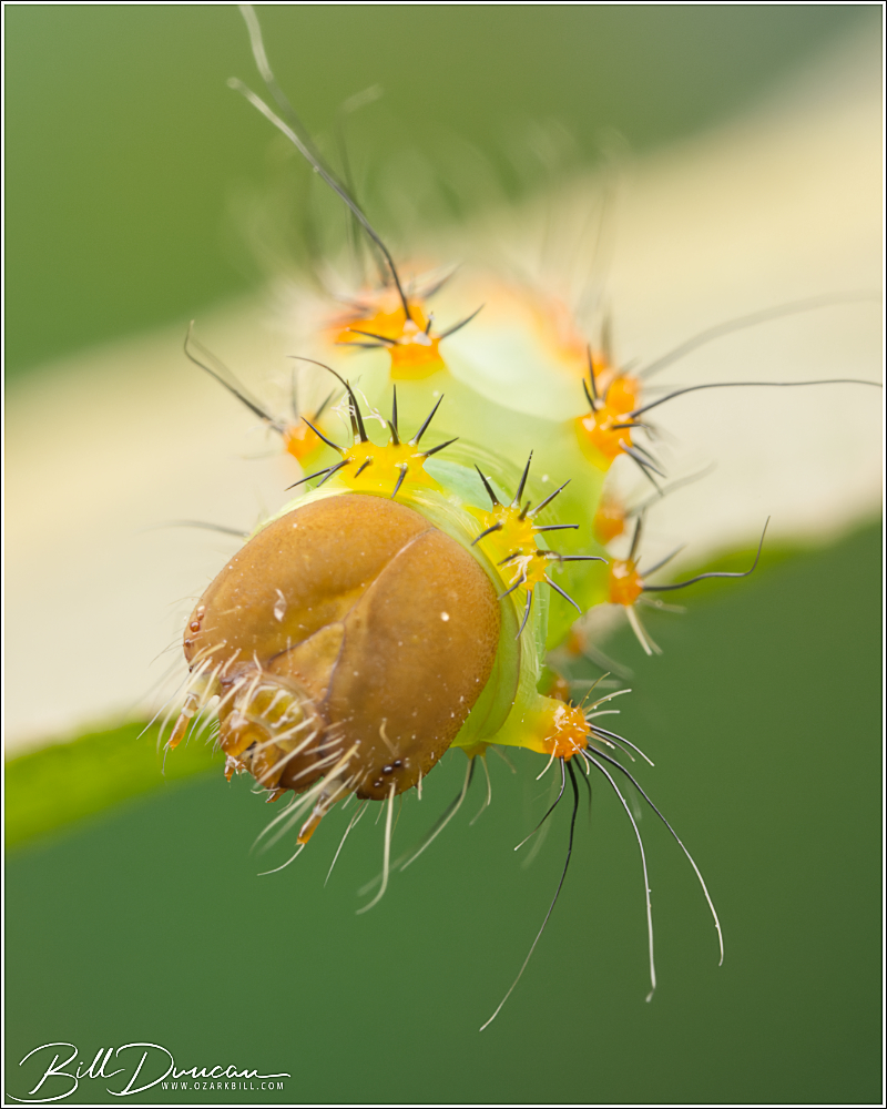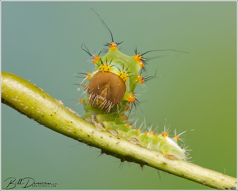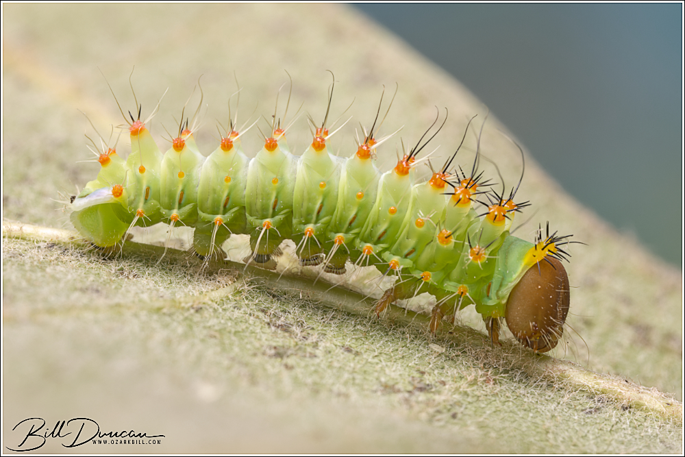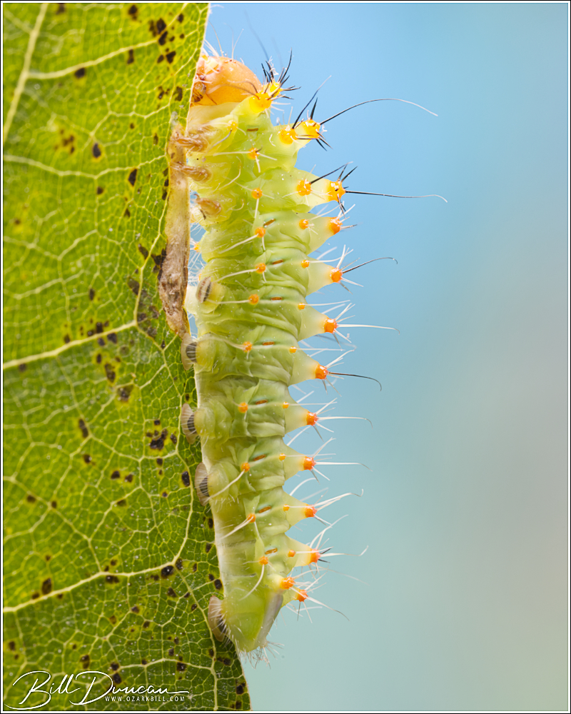 A couple of friends and I went to visit some sand and gravel hill prairies in central Illinois yesterday. Although it is a delight to visit those places and their unique floral communities, we didn’t find a lot to make us pull out the cameras. We took a short break from walking through the prairies in near perfect weather for an August day and did a little cat hunting in the nearby Sand Ridge State Forest. Along with some hungry mosquitos we happened across this cute little one feeding on a species of red oak. This is the silk moth Antheraea polyphemus. This species is among the largest caterpillars to be found in our area, but this guy was pretty tiny. I believe this is a 2nd instar.