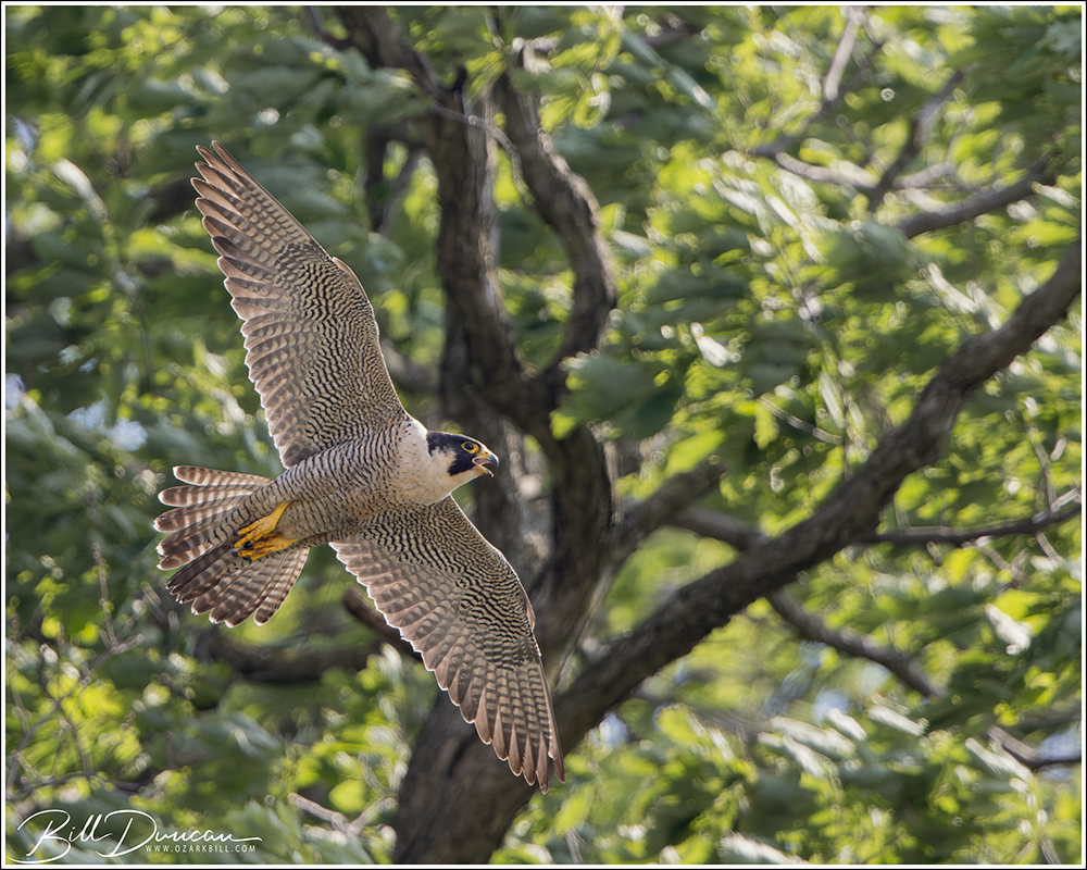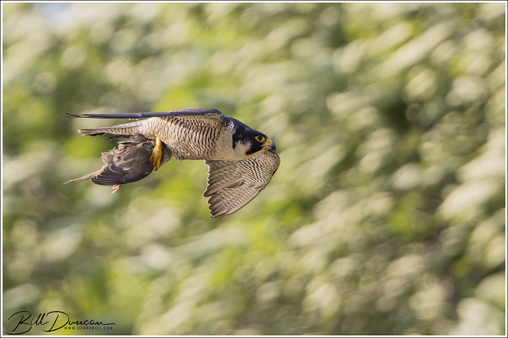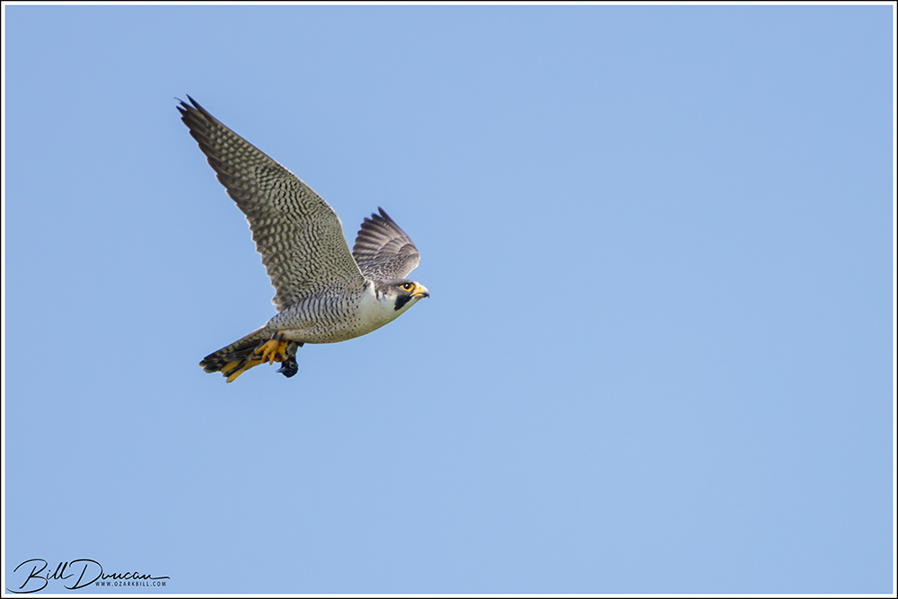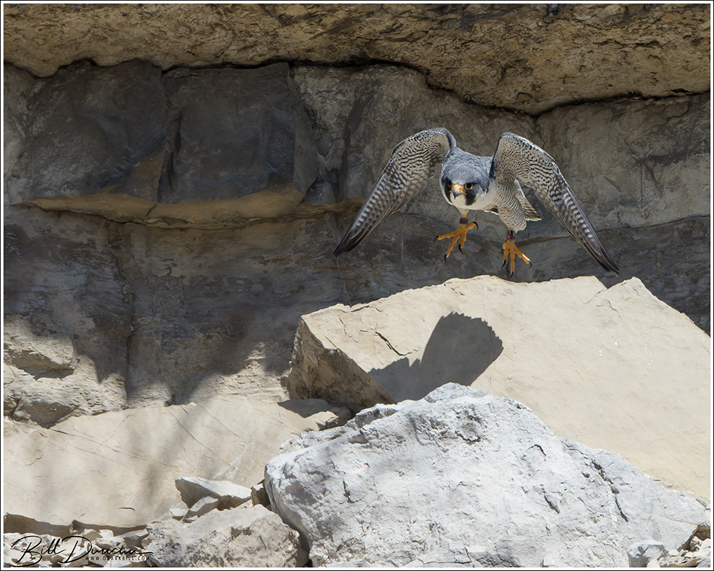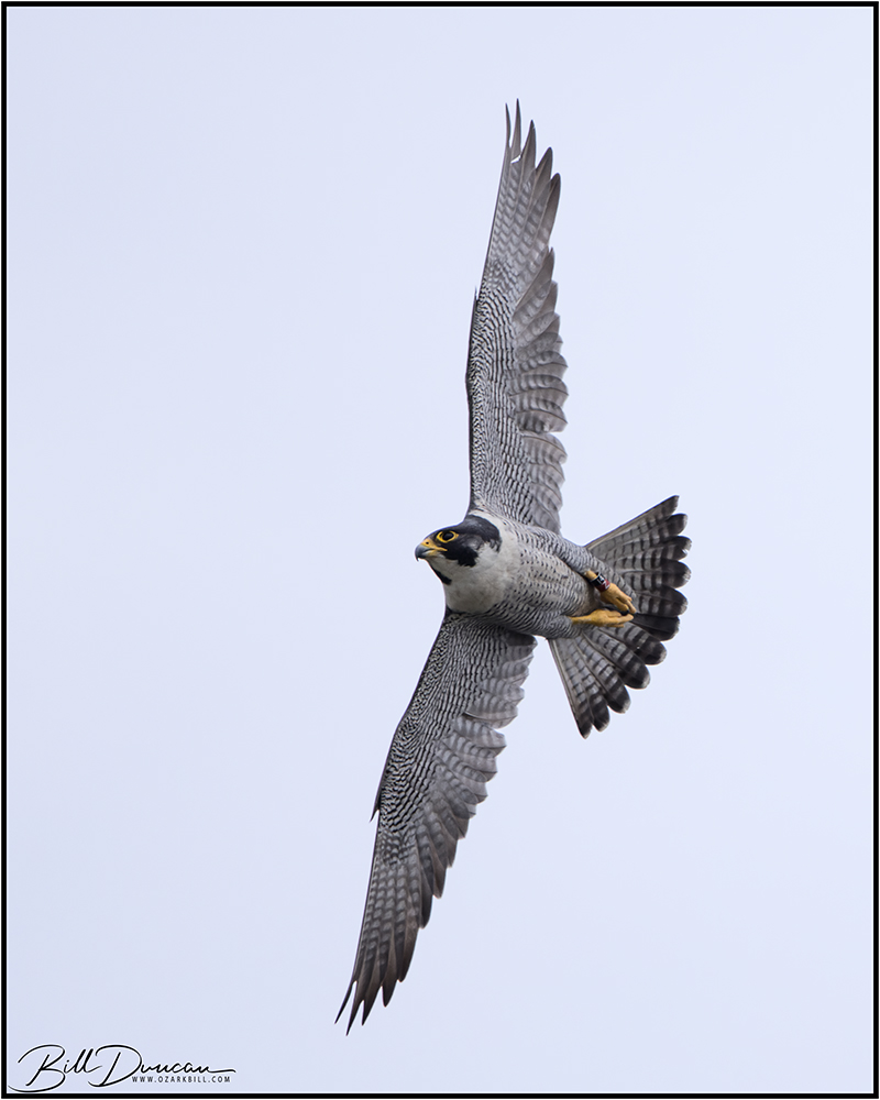 The male adult Peregrine Falcon sporting identification bands he received while he was in the nest.The female Peregrine Falcon was not banded.The male brings a freshly caught Meadowlark, making obvious vocalizations to make his intentions known.The female picks up the prey and flies to another perch to feast on the nuptial gift.