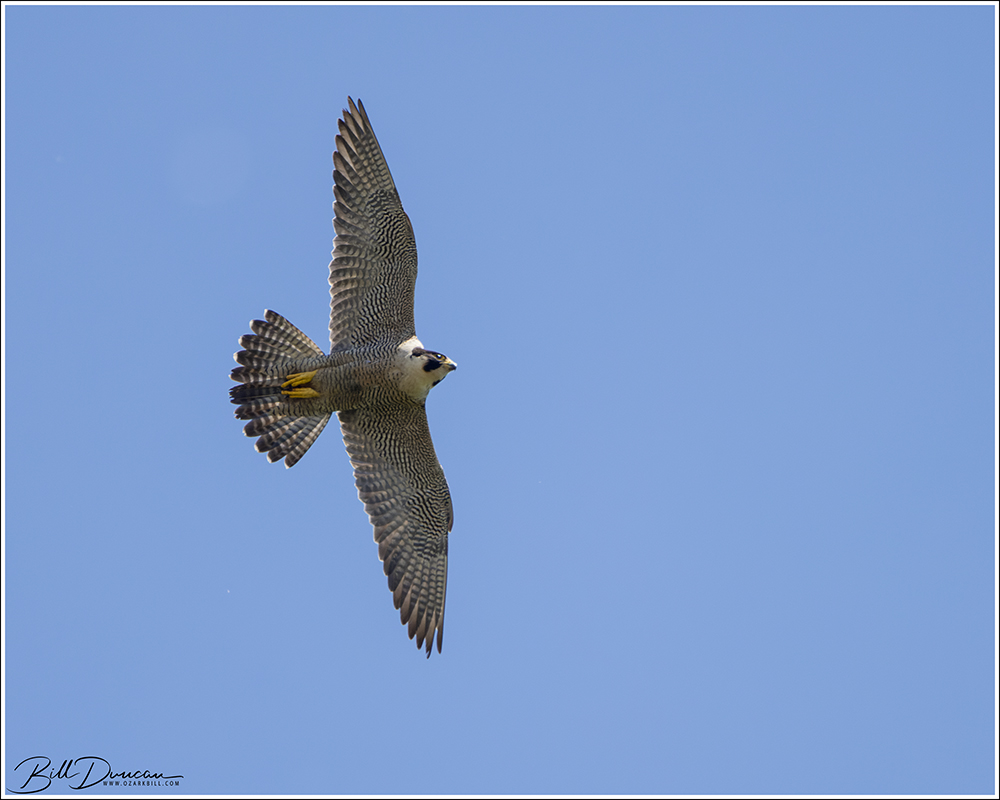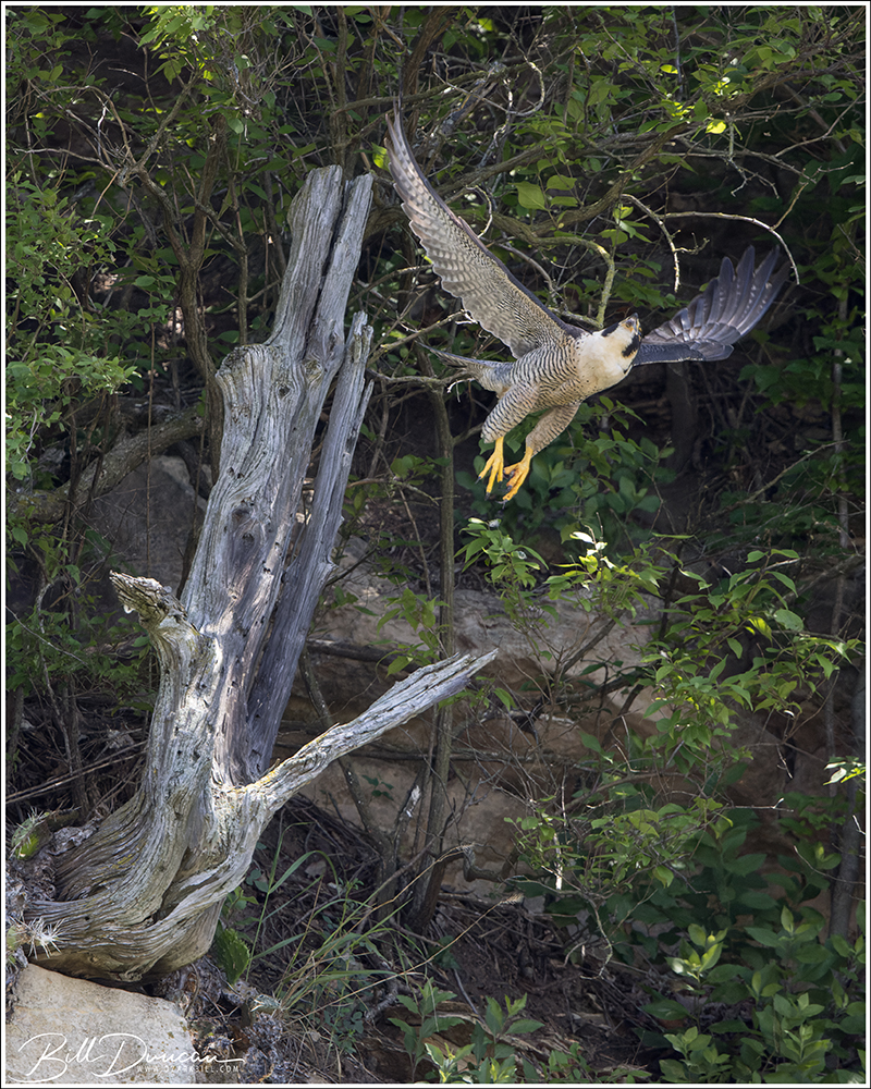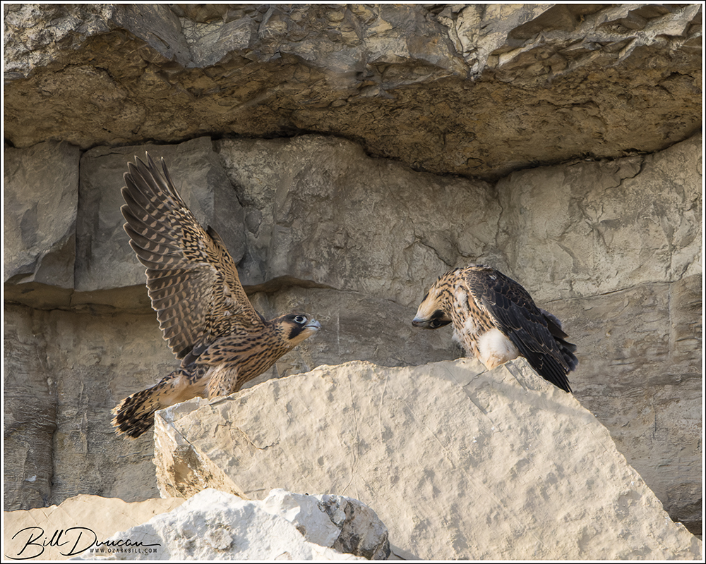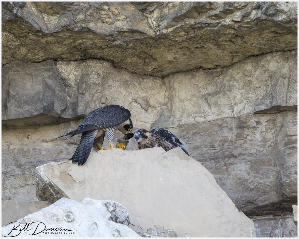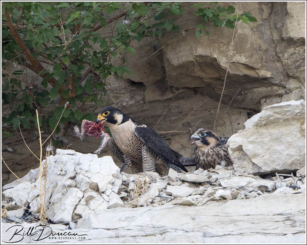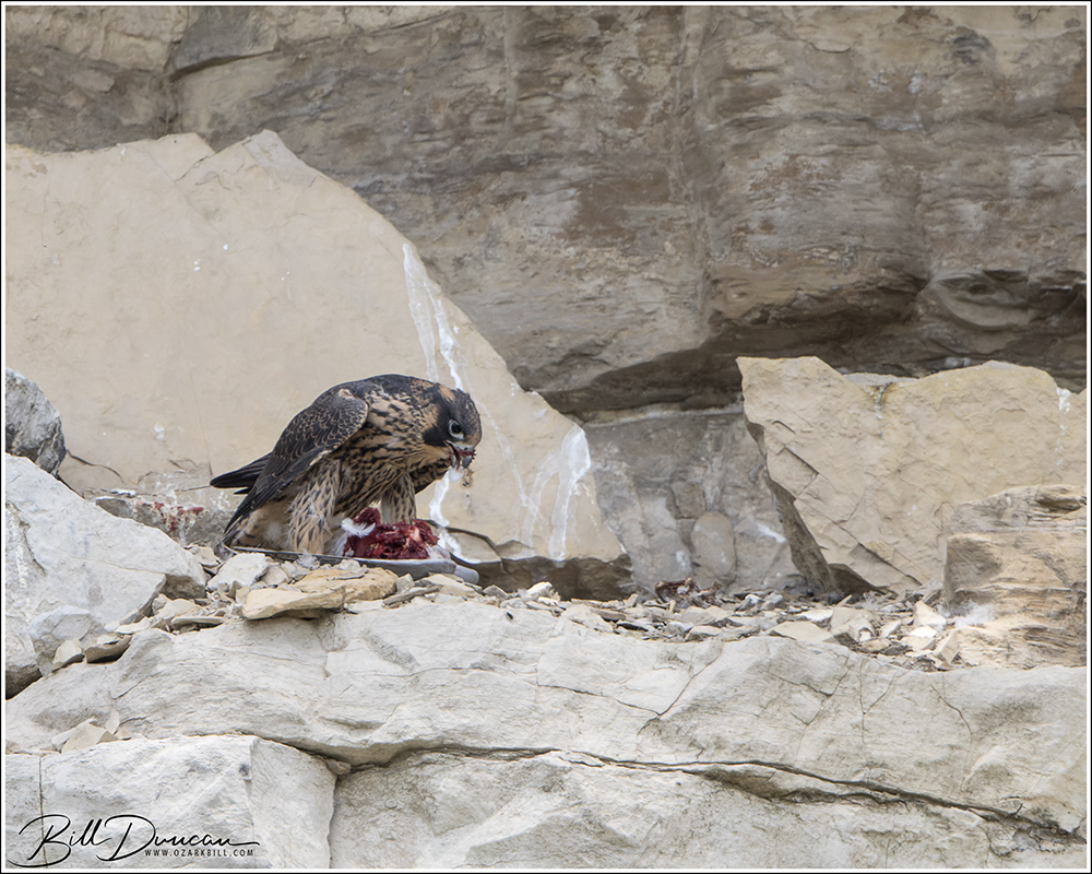 Unfortunately, we didn’t have an opportunity to get back to the nest site until late May. When we returned, we found the parents were busy raising four already good-sized chicks. The photography was challenging. We had to contend with the too-speedy traffic of the river road that lied between us and the bluff face where the nest was located and the heat distortion that this blacktop created. There is also the issue of trying to photograph the fastest vertebrate on the planet.