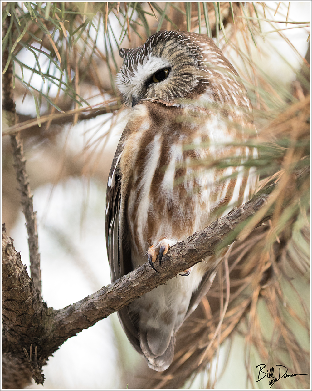 Saw-whets are year-round residents across southern Canada and the northern U.S. but winters across most of the continental U.S. They typically can be found roosting 3 – 12′ in conifers but can also be found in honeysuckle tangles in winter locations where their preferred conifers may not be abundant. Banding programs, made up of mostly citizen scientists have only recently begun to shed light on the seasonal migratory movements of this species. Along with locations and dates, these banding programs have shown that most migrants are females or immature males. Adult males stay on breeding grounds during winter, presumably to hold onto prey-rich territories.