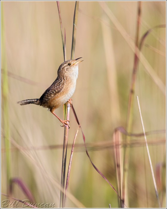 More often heard than seen, this quite secretive wren rarely is found more than a few feet off the ground. Like a mouse, these guys spend a great deal of time low in the tall grasses and sedge of wet meadows/prairies. In July and August taking a walk in this type of habitat within their range will certainly guarantee you will hear their consistent staccato vocalizations as they work to define their small territories and keep rival males at bay. Trying to lay the glass on these birds is much more difficult. These guys rarely will respond to pishing, and if driven out of their particular patch of grass they will simply skirt above the grasses for a second or two before dropping back into the bush, yielding partial, unsatisfying glimpses at best. To get this shot, I admit, I used a vocalization playback. I played just a few bars and waited. This guy was not happy with that! He raced out of his hiding whole and began singing forcefully in attempt to send the potential usurper out of his territory. I was happy with the few quick bursts of the shutter I was able to get and that was that. He may have been a bit stressed, but I bet the burst of testosterone he received from successfully defending his kingdom more than made up for it.