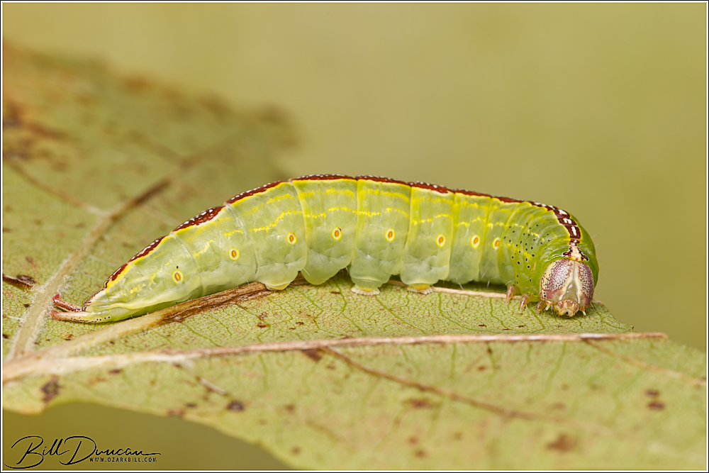 Notes: Caterpillars of S. canicosta (red-humped oakworm) and S. albifrons (white-headed prominent) are indistinguishable as larvae and are so similar as adults that the only way to distinguish the two is by dissecting the genitalia. Both species are found in Missouri and both feed on the same host plants – beech, chestnut and oaks (any members of the Fagaceae).