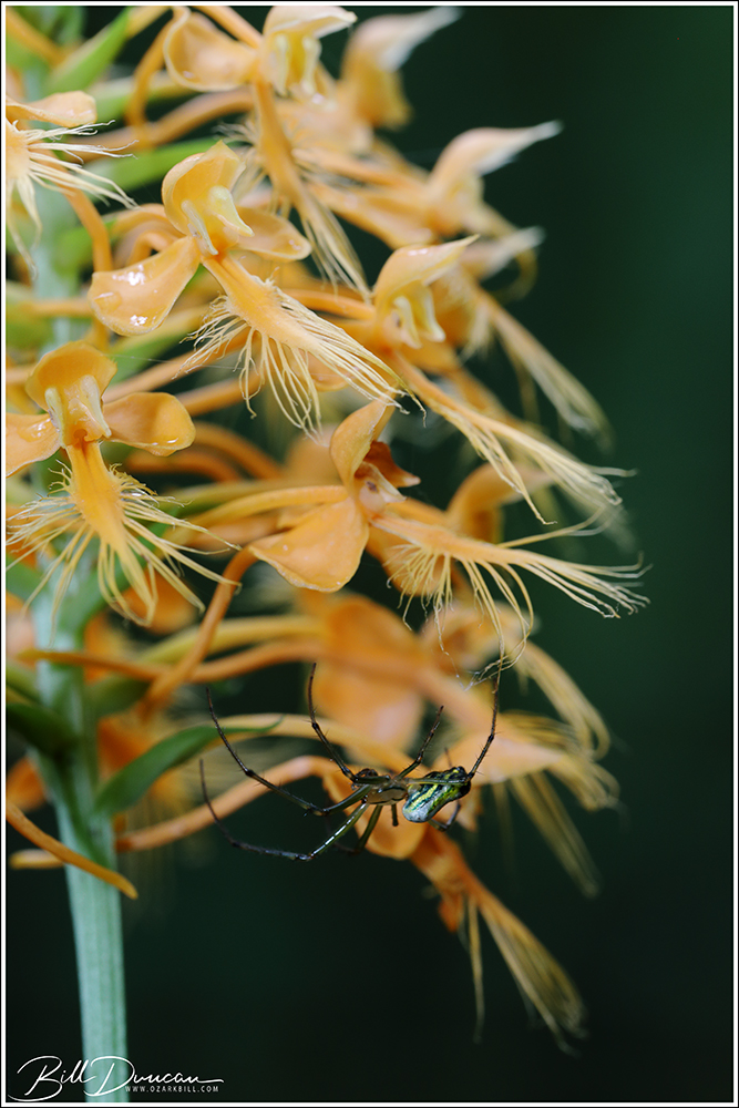 A closeup of an orchard spider (Leucauge venusta) moving among the blooms of Platanthera ciliaris.