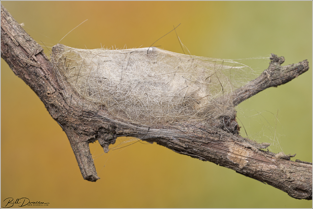 Once the larva has reached its final instar, it will spin a cocoon in a sheltered location, often on the trunk or branches of trees, beneath loose bark, or on the sides of buildings. The cocoon is made from silk and incorporates most of the caterpillar’s own urticating body hairs, offering added protection from predators.