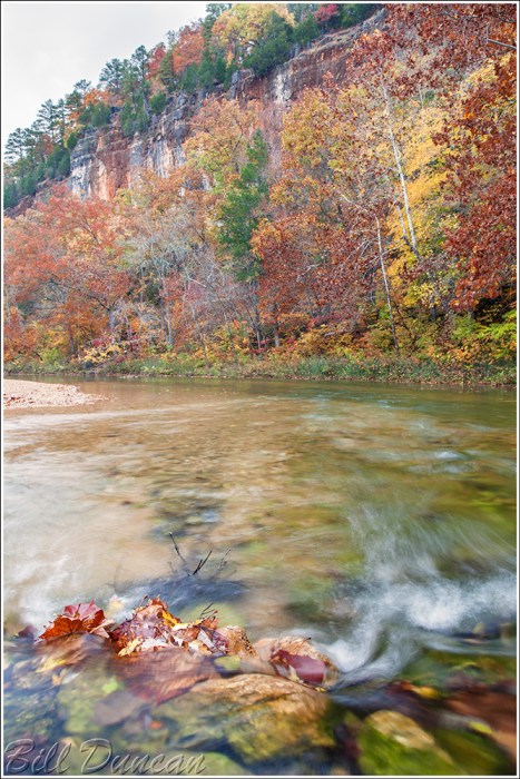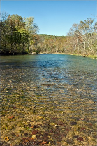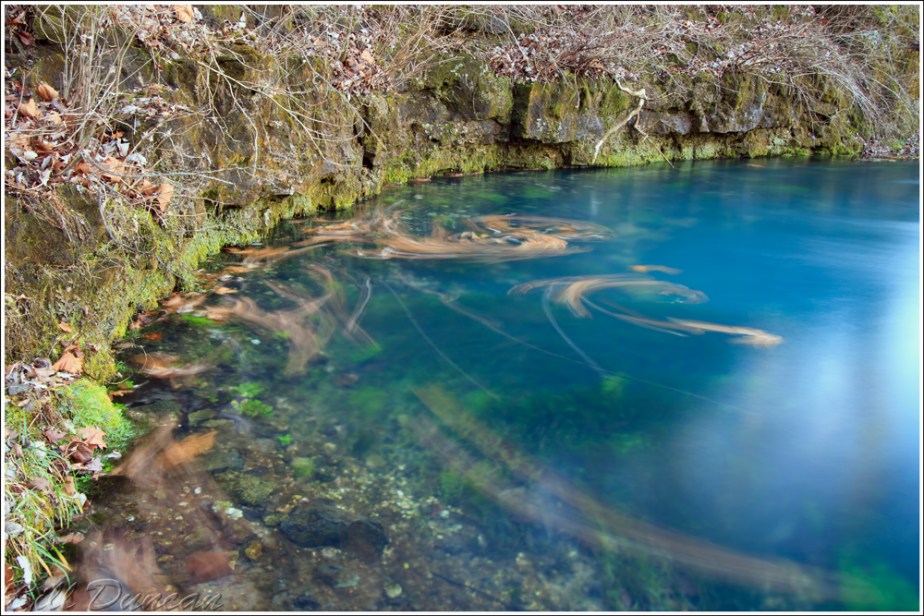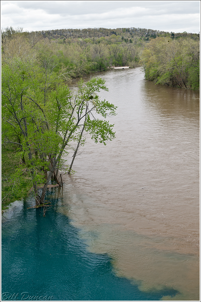 Sarah’s and my recent trip to Big Spring country provided us with lots of different looks that only the Ozarks in spring can provide. On our second day the region was subjected to a strong storm front that dumped nearly five inches of rain in about a 12 hour period. Although that limited the time spent outside cabin or vehicle, it did bring some learning opportunities. I have often wondered with what speed and “precision” these large Ozark springs and their karst systems reacted to new rainfall in their watershed. Would a deluge such as this become immediately apparent in the relative rate of discharge at Big Spring? Or would the dynamics take a longer period of time? My prediction would have been that the system would take up some considerable slack and act like a sponge. That the effluent from the spring would rise eventually, but not as quickly as the rains came. I turned out to be wrong. During the first 12-18 hours, the increase of discharge from the spring seemed to keep pace with the rate of rise in the Current River. This photo was taken at mid-morning the day after the rains. Here the spring’s aquamarine waters are flowing into the already mud-laden flood waters of the Current. I estimate the waters were about two to three feet above normal at this time.