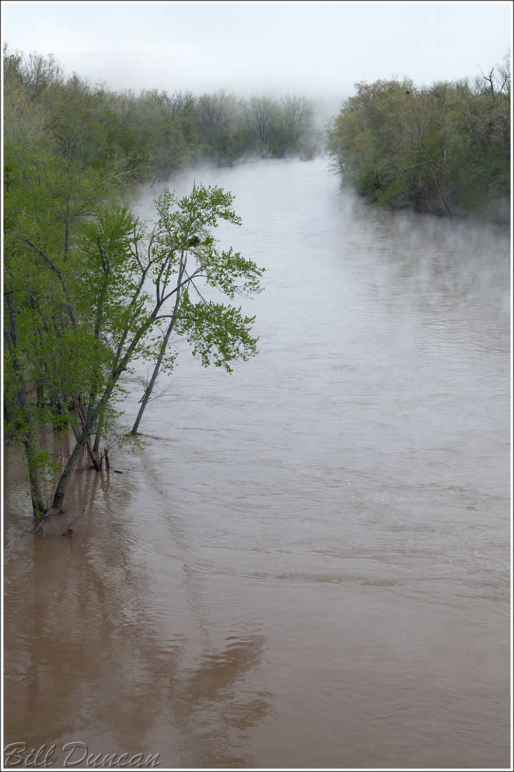 The next morning the scene looked quite different. It looked to me the Current had gained enough water to rise over the shallow points of land this far into the effluent channel. Water was everywhere, completely covering the lower section of the Chubb trail, completely covering the dock and railings surrounding it, and blocking access to the spring accept by the main road. Even with the extra water the boil from the spring was still quite noticeable.