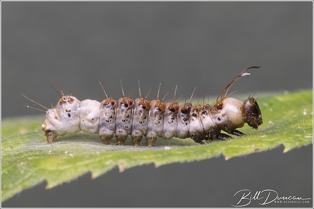 I’m pleased to say I found a “holy grail” caterpillar species this year. Unfortunately, at the time, I did not know what I had found. On July 13th, while searching right off a parking lot at Huzzah Conservation Area in Crawford County, MO, I found this smallish bird poop mimic caterpillar. I knew I had seen this one in photos before, but on this day I had left my field guides at home and I was in an area with absolutely no cell phone coverage.