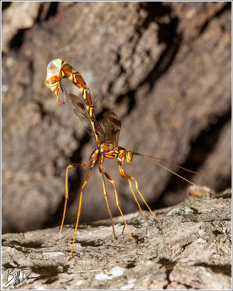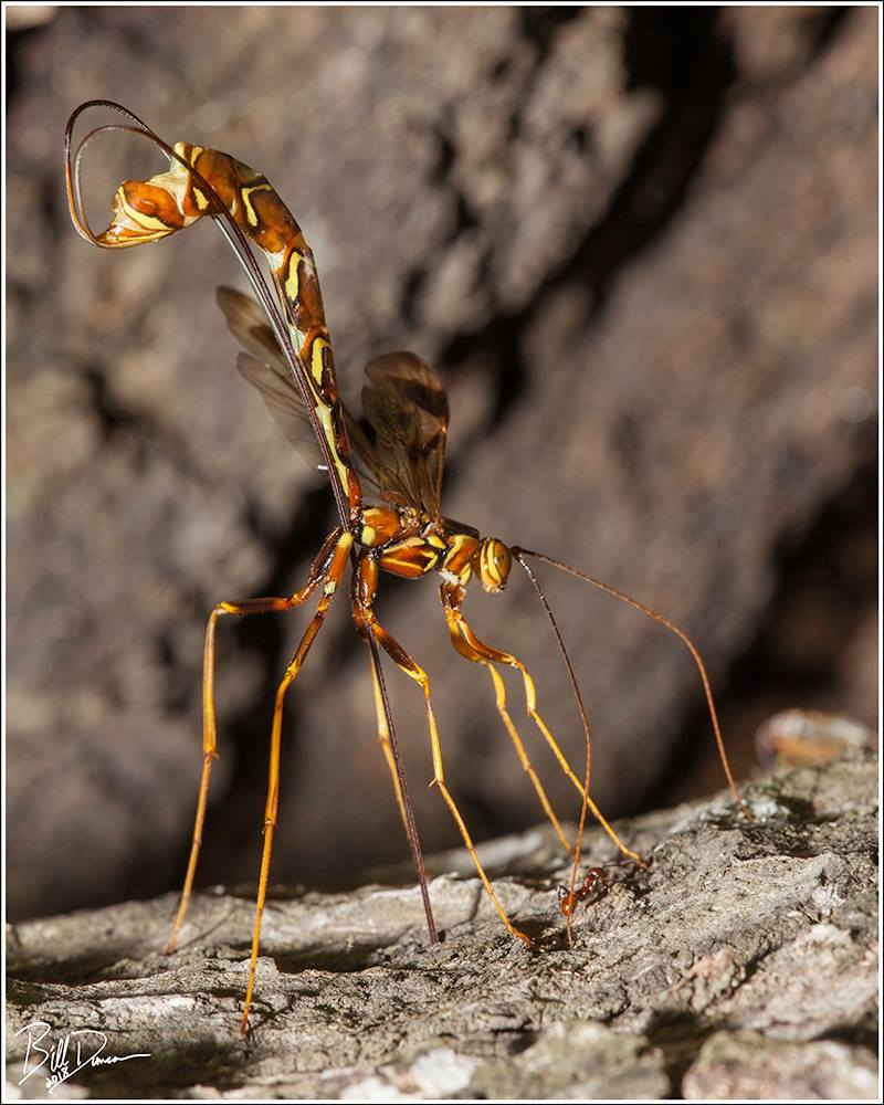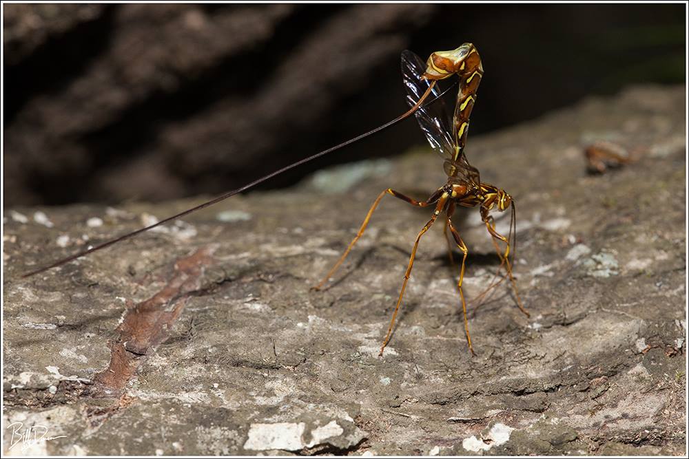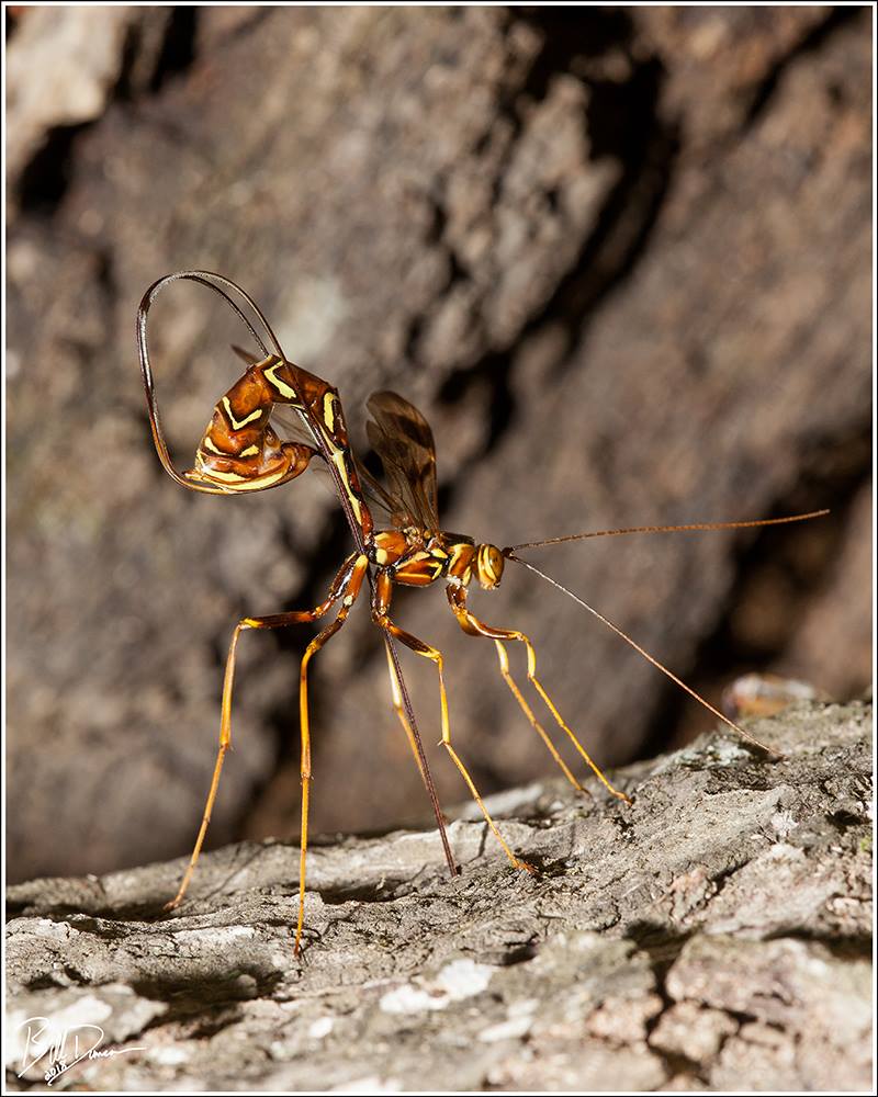 The long-tailed giant ichneumonid (Megarhyssa macrurus) is our region’s largest ichneumonid wasp. This species is a parasitoid and its sole host is the pigeon horntail (Tremex columba, fam. Symphyta) that bores tunnels into decaying hardwood species. The long-tailed giant ichneumonid uses its keen senses to find the host and then uses its long ovipositor to drill into the tunnel where it lays an egg and injects venom to paralyze the horntail. This species does not sting.