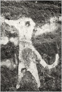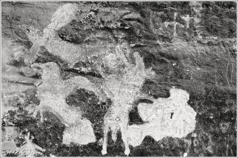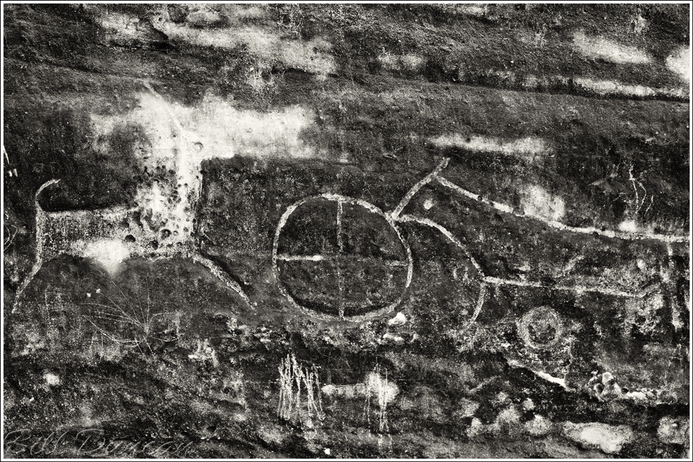 This is another of the more famous scenes at this spot. It looks to be a white-tailed deer and a dog or wolf on either side of a crossed/quartered circle. I find the quartered circle very interesting. Reading a bit on the subject of pre-columbian art work, I discovered that petroglyph analysis is a very subjective science. There are numerous theories as to what exactly the quartered circle represents. These theories range from representations of stars, the directions of the compass, the earth itself, the earth-wind-fire-water elements, the four seasons, directional markers that depict spiritual locations, and even symbols depicting an early form of Christianity. It seems to me we have no idea what these symbols represented in these cultures. What really fascinates me about these forms is that they were found across North America in time and space. Seemingly unrelated cultures from northern Canada to southern Mexico were known to use the quartered circle in petroglyphs and pictographs. This may be coincidental, or as the Cahokia Mounds metropolis location shows, the trade routes of the Mississippian culture were quite large. Cultural icons, along with trade goods were likely exchanged across surprisingly large distances.