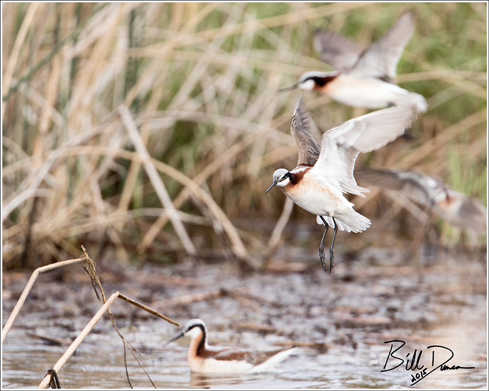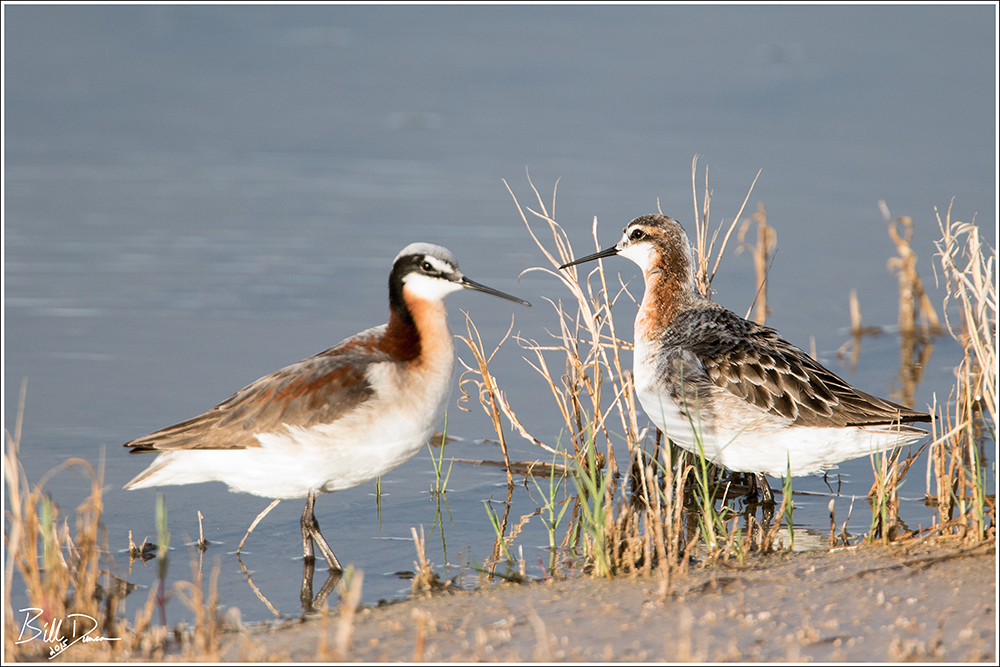 The Phalaropes are quite the interesting group. First of all, two of the three species are considered pelagic – meaning they spend a great part of their time out at sea, away from visible land. The Wilson’s Phalarope, pictured throughout this post was the most abundant of the shorebirds during our visit to Quivira NWR, and do nest within the refuge. The Phalaropes exhibit reverse sexual dimorphism – both in visual and behavioral characteristics. This means that females are the more brightly colored of the sexes. Similarly, the females display and fight for males. The males will immediately take over the responsibilities of incubating the eggs and raising the chicks, while the polyandrous female will attempt to find and mate with other males. See the photo below of a relatively drab male with his mate.