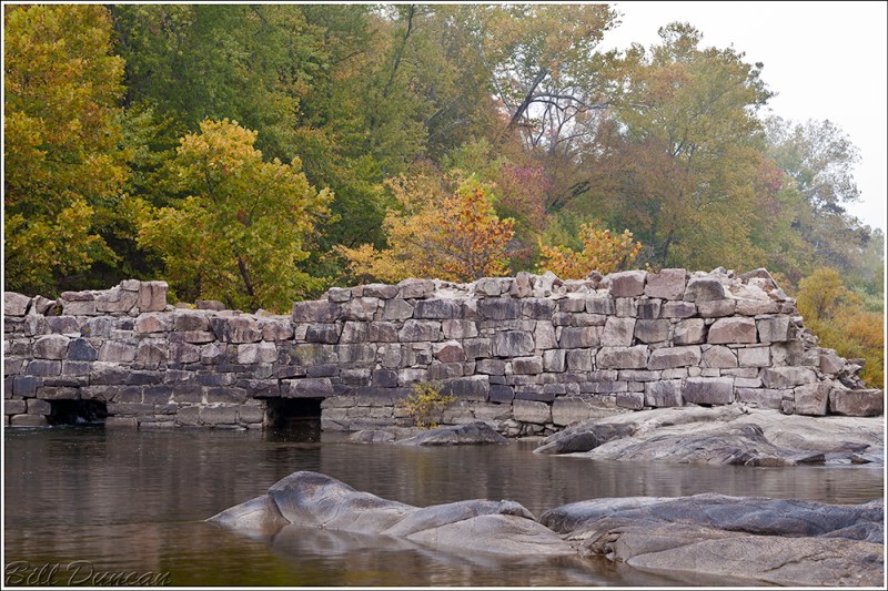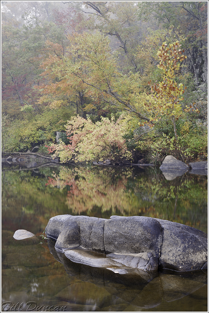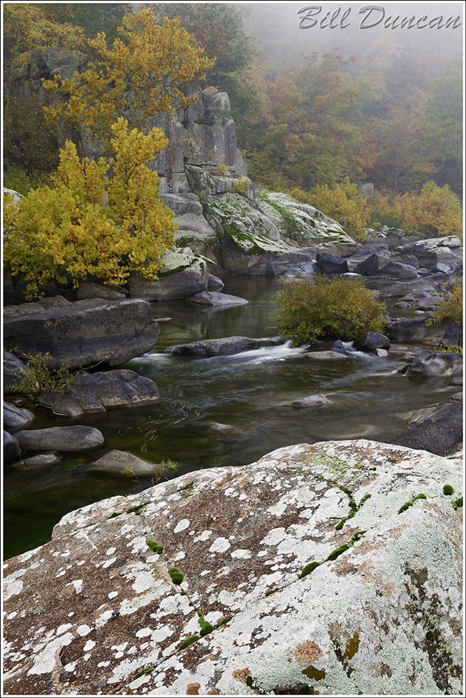 There is a relatively easy path between these two points, but Stephen and I followed along the river, jumping from boulder to boulder for most of the stretch. We were pleasantly surprised arriving near dawn to find a nice blanket of fog. While fog tends to lessen contrast considerably in a photographic frame of mind, the lighting helps those wonderful fall colors pop. In person, eyes are drawn to a bright warm maple growing between riverside rocks. Once my camera was out, we were in danger of spending the entire day within the first quarter mile of our hike. I do appreciate Stephen’s patience as I took the time to set up the tripod and repeatedly dove into my bag to swap lenses.