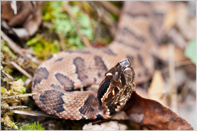 Although making Stephen a bit apprehensive, I was completely stoked that were able to cross paths with five cottonmouths, including this cute little juvenile. This one I spotted almost on the trail as he flapped his bright-white mouth at me, mere inches from my boot. My first thought was of a small moth or butterfly flapping its wings in alternating bright dorsal and dull ventral aspects. Taking a second, closer glance I was able to pick out this well-camouflaged beauty. I think Stephen will pay me well to save the story of what happened when we came upon a larger relative of this guy in the crevice of a couple of boulders. 😉