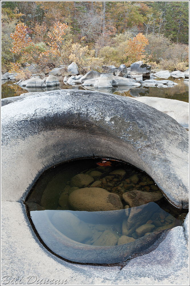 Specifically referred to as potholes, this feature was found in the long stretch of shut-ins of the St. Francis River between Silvermines Recreation Area and Millstream Gardens. Steve and I took this, one of our favorite hikes, this autumn, just before peak color came into this section of the Ozarks. Here is a wonderful description of this feature’s formation from Tom Beveridge’s Geologic Wonders and Curiosities of Missouri: