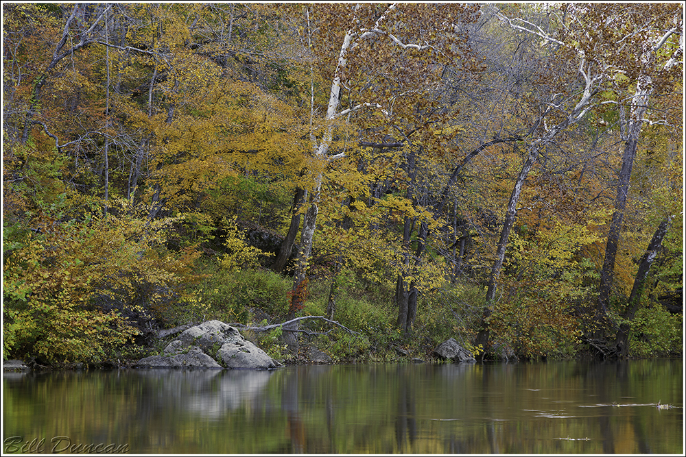 There is a relatively easy path between these two points, but Stephen and I followed along the river, jumping from boulder to boulder for most of the stretch. We were pleasantly surprised arriving near dawn to find a nice blanket of fog. While fog tends to lessen contrast considerably in a photographic frame of mind, the lighting helps those wonderful fall colors pop. In person, eyes are drawn to a bright warm maple growing between riverside rocks. Once my camera was out, we were in danger of spending the entire day within the first quarter mile of our hike. I do appreciate Stephen’s patience as I took the time to set up the tripod and repeatedly dove into my bag to swap lenses.