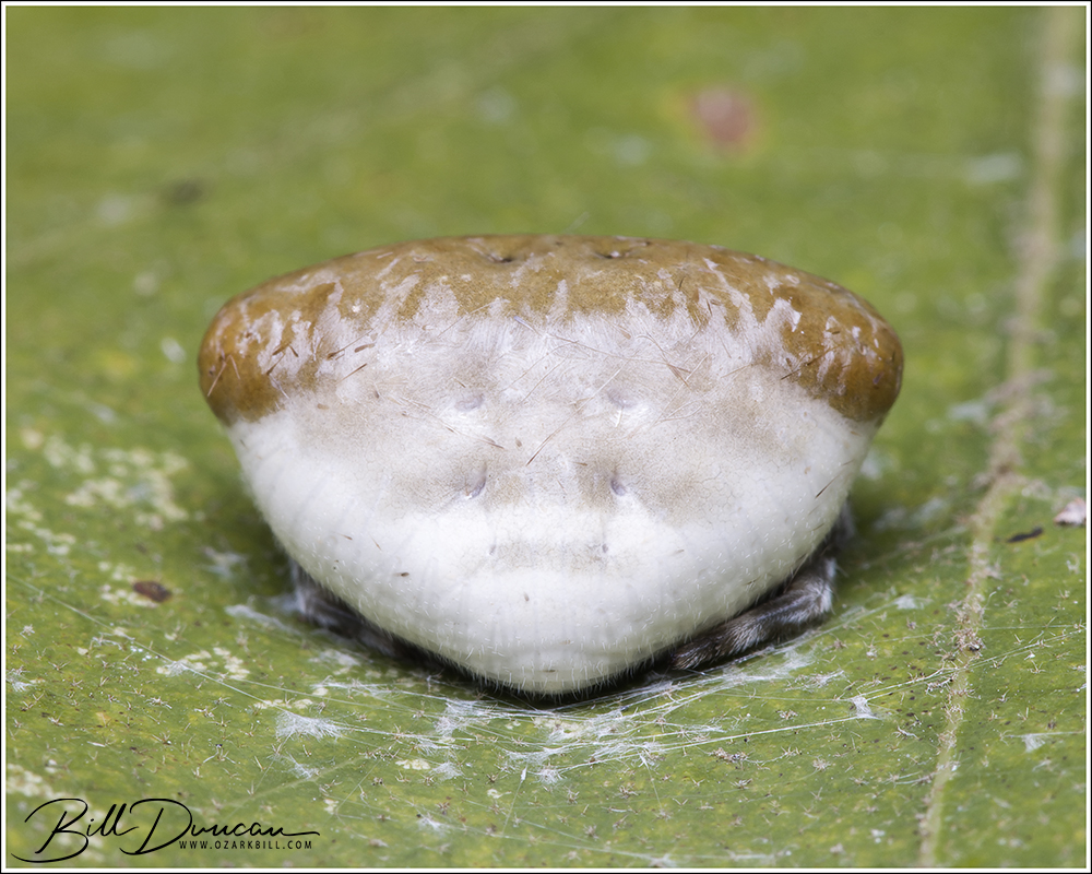On a cat hunting trip to St. Francois State Park in September, Casey and I had the great fortune of finding one of the coolest spiders in the state – the toadlike bolas spider (Mastophora phrynosoma). Females of this species are well known for their unique hunting method. By day, they sit around, often out in the open, looking very much like a bird dropping. At night, instead of building webs, they move to the edge of a leaf or twig and hang a single line of silk with one or more sticky globules attached – their “bolas” that they use to ensnare moths and other flying prey. See this great video by the BBC for a demonstration of this.
