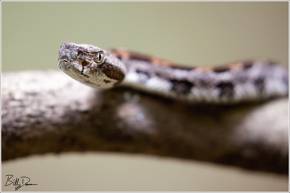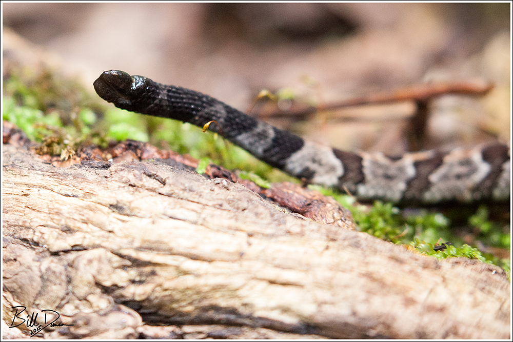 Remember when I said we were not expecting to find much of anything besides the birds on our trip down “Snake Road”? There, in the middle of the road, we discovered the guy you see in the next image, and I discovered I made another huge mistake. On more than two occasions now I have been in a circumstance of not being able to make a photograph, or the photograph I had envisioned, because I did not bring the necessary equipment. On this day, my only equipment was a 500mm lens on a 1.6 crop body and my iPhone. After contemplating throwing myself on the viper to end my pathetic existence once and for all, I decided to give a shot at shooting a snake with an equivalent focal length of 800mm! On a partly cloudy day with lots of tree cover, I knew that lighting the subject would be difficult. Of course, I had no artificial light source either. Shooting wide open, depth of field was nearly nonexistent. This was the result of my first attempt.