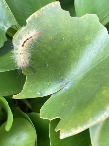 In early September 2024, I observed six mid- to late-instar larvae of O. leucostigma, each feeding on the leaves of Nymphaea odorata (Nymphaeaceae) that were growing in a small artificial “pond” in my St. Louis County, MO suburban yard. Unfortunately, these insects consumed every available leaf of N. odorata in the pond before they could pupate. The only other species in the pond available to them was the exotic Pontederia crassipes (water hyacinth), which they did not readily consume. I was able to locate and remove five final-instar larvae from the remnants of the original host leaves and placed them in an outdoor cage where they successfully switched to feeding on leaves of Quercus muehlenbergii and Q. imbricaria (both Fagaceae). Within seven days, all five larvae built cocoons to pupate within.