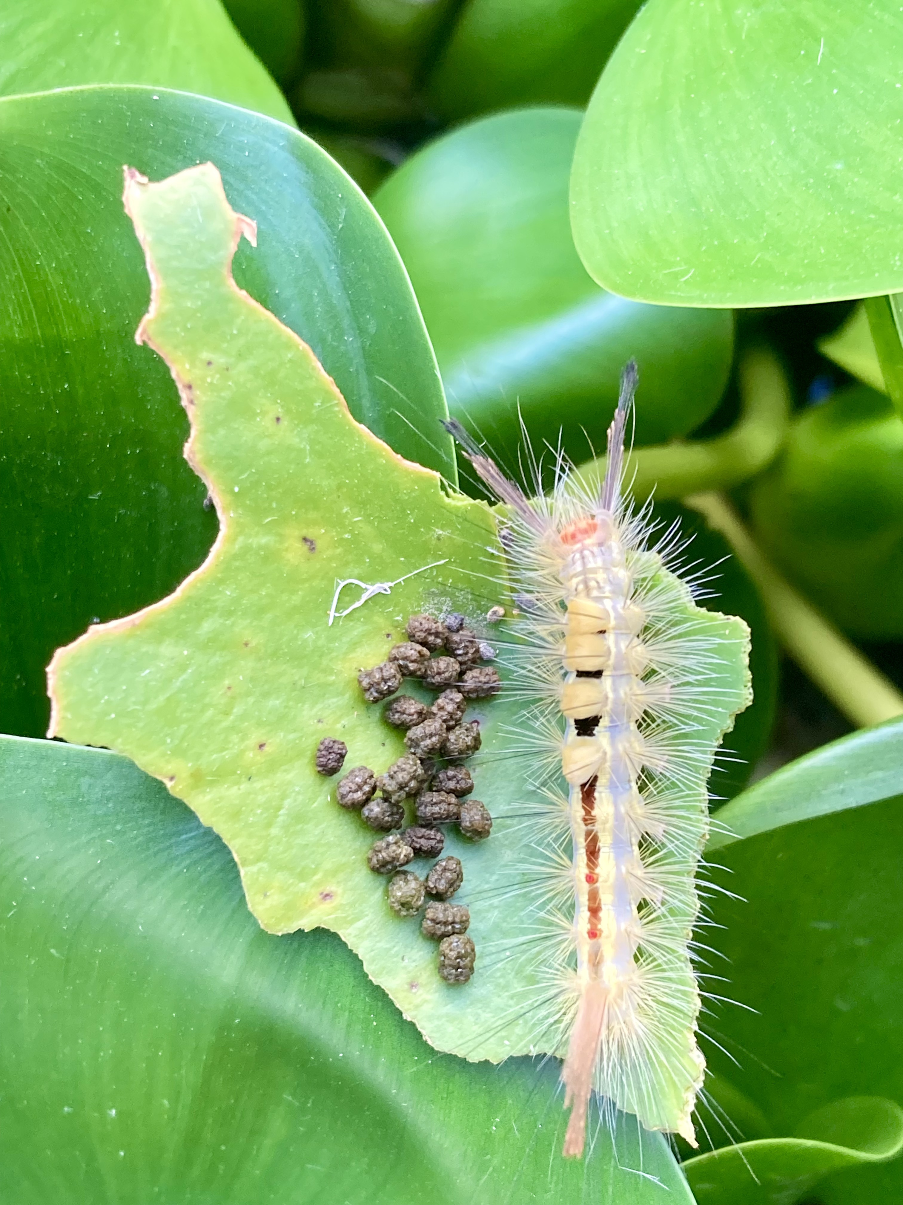 In early September 2024, I observed six mid- to late-instar larvae of O. leucostigma, each feeding on the leaves of Nymphaea odorata (Nymphaeaceae) that were growing in a small artificial “pond” in my St. Louis County, MO suburban yard. Unfortunately, these insects consumed every available leaf of N. odorata in the pond before they could pupate. The only other species in the pond available to them was the exotic Pontederia crassipes (water hyacinth), which they did not readily consume. I was able to locate and remove five final-instar larvae from the remnants of the original host leaves and placed them in an outdoor cage where they successfully switched to feeding on leaves of Quercus muehlenbergii and Q. imbricaria (both Fagaceae). Within seven days, all five larvae built cocoons to pupate within.