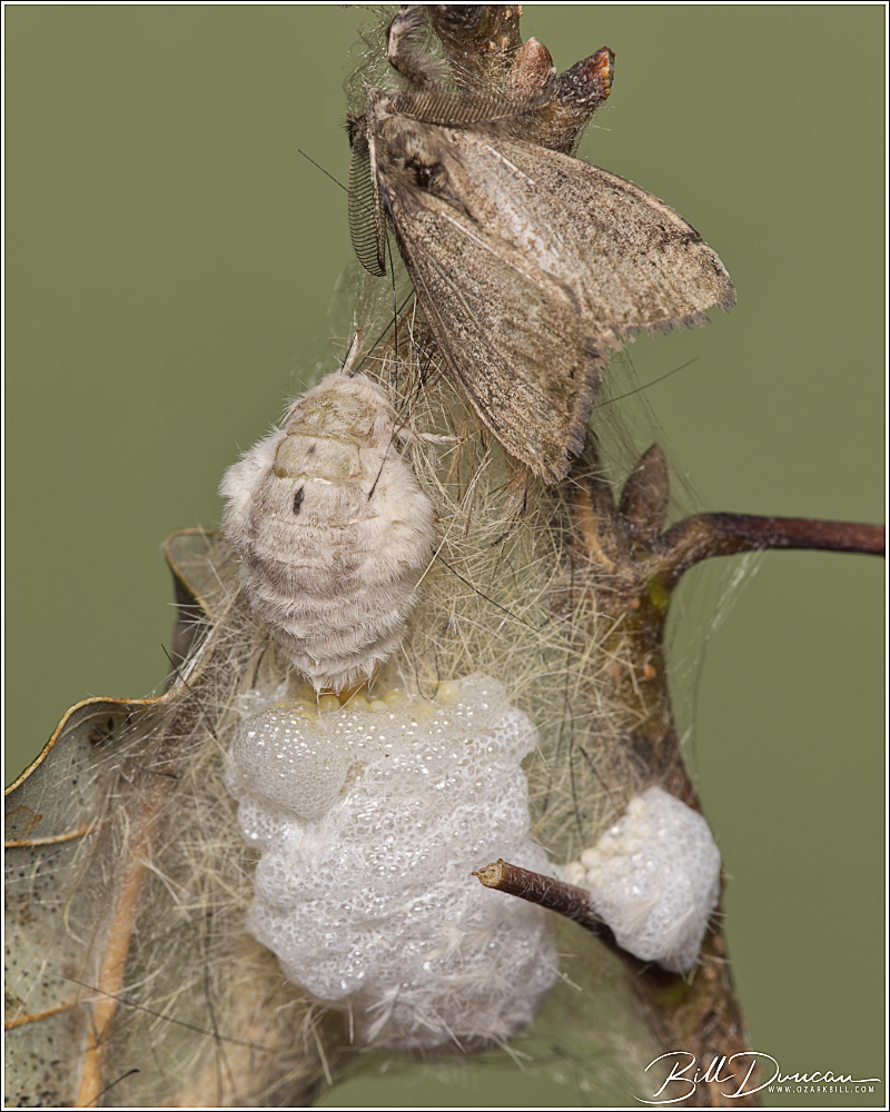 While observing and photographing these activities, I happened to notice that a jumping spider (F. Salticidae) was attacking one of the females prior to her ovipositing. The spider must have come from the oak branches that I placed in the enclosure to finish rearing the caterpillars. I took enough time to take a few photos of this and then removed the spider with a pair of forceps. I noticed a drop of hemolymph on the back of the female after removing the spider. However, the female did not seem too bothered by this and created her egg mass within a couple of hours of this incident.